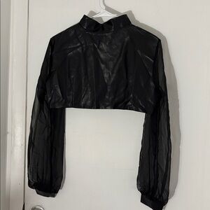 Elevate your style with this chic black crop top featuring elegant sheer sleeves. Perfect for a night out or a stylish day look.
