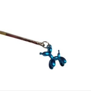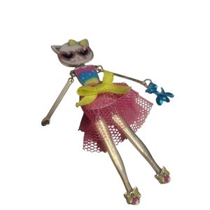 Whimsical silver-tone and enamel cat brooch. Cat is wearing a pink, blue and yellow striped top with a pink net skirt tied with a yellow bow. Arms and legs move. Toy poodle dangles from one arm. Cat is wearing heart-shaped glasses with yellow bows on her shoes and ears. Straight back pin with barrel clasp. Brooch measures 2 3/4" tall. New without tags.