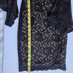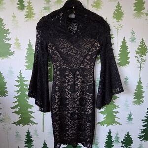It also features long, bell-shaped sleeves, a high neckline with a keyhole detail, and a fitted body. The dress is made of black lace with a nude-colored lining underneath.