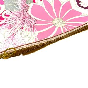 This wristlet clutch features a vibrant pink floral design, perfect for adding a pop of color to any outfit. Crafted with attention to detail, it's both stylish and functional.