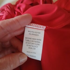 Rebdolls red satin long sleeved tie front blouse made of 94% polyester and 6% spandex. It measures approximately 21" from pit to pit, 16.5" between shoulder seams, 25" sleeves, and 19"-21" in length. Good used condition, size large.