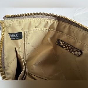 Chic Michael Michael Kors zip-top wristlet in a neutral snakeskin print with gold-tone logo hardware. Slim, structured silhouette works perfectly as a clutch or wristlet for day-to-night wear. Features a removable wrist strap, smooth zip closure, and a fully lined interior with slip pocket and card slots. Lightweight yet polished — ideal for essentials, travel, or evenings out.