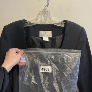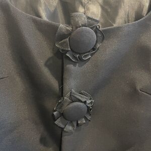 The Willa Han 100% Silk Black Square Neck Blazer Jacket in size 8 is a luxurious and classic piece perfect for various occasions such as formal events, parties, or business meetings. This vintage-inspired blazer features a button closure, long sleeves, and a solid black color with accents of bows. Made from high-quality silk with polyester insulation, this lightweight jacket is lined and suitable for all seasons, making it a versatile addition to any wardrobe. Ideal for those looking for a designer piece with a touch of old money style, this blazer exudes elegance and sophistication.