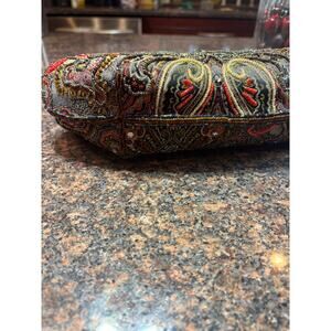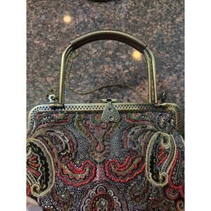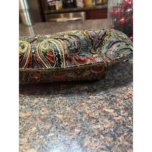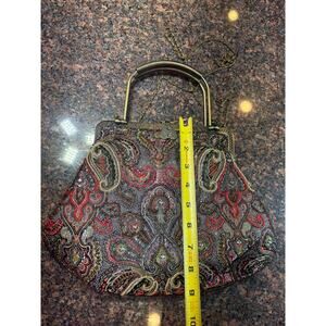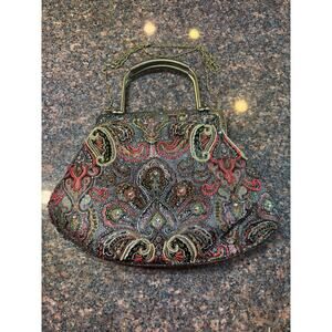 Vintage Style beaded and embroidered paisley bag. Black, red, cream. Metal frame and handles with a heart latch and chain for shoulder. Measures approximately 9"x11". Like new condition.