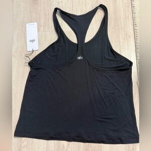 Sleek black tank with racerback design. Ideal for workouts. Soft and breathable fabric.