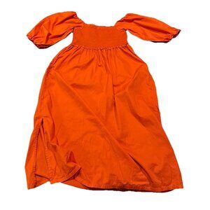 The Free Assembly Women's 100% Organic Cotton Tangerine Elastic Top Midi Dress is a stylish and sustainable choice for women. Made from high-quality organic cotton, this dress features a vibrant tangerine color off the shoulder puff sleeves , adds a pop of color to your wardrobe. The midi to long length and elastic top make it comfortable and flattering for all-day wear. Perfect for casual outings or dressed up with accessories for a night out, this colorful dress is sure to make a statement.