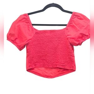 Japna Red Smocked Peasant Crop Top Puff Sleeve Medium 100% Cotton Boho Festival