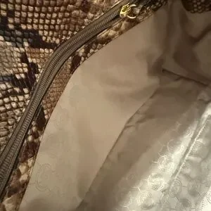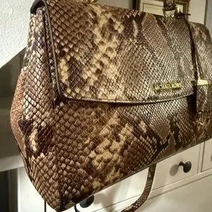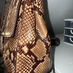 Stylish Michael Kors leather satchel with a striking snake print. Perfect for adding a touch of elegance to any outfit. Features a top handle and gold-tone accents. Inside zip pocket, metal feet and dust bag. Brand new, never worn.