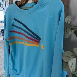 Vibrant blue sweatshirt. Features rainbow stripe design. Comfortable and stylish.