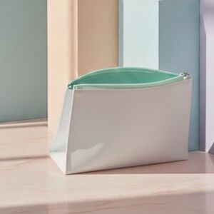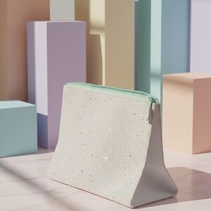 Chic Clinique pouch with a glittery texture. Paired with a metallic silver lipstick.