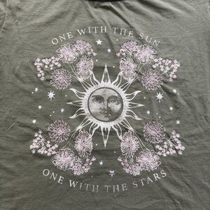 Beautiful Olive green colored tshirt with sun graphic and embroidered flowers. 100% cotton, soft and light.