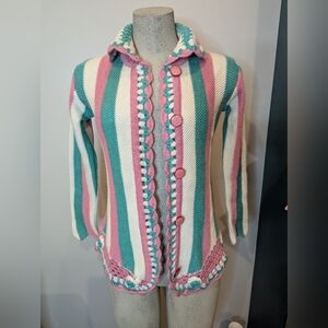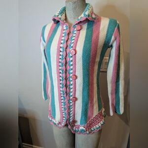 Vintage Striped Pink Ivory and Teal Whimsical Grandmacore Cardigan Size S