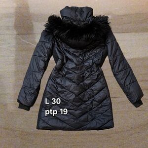 Elegant charcoal puffer coat. Features a warm, fur-lined hood. Ideal for winter wear. like new
