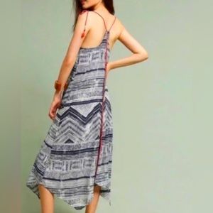 Stylish midi dress with geometric patterns. Features striking red straps and trim. Perfect for any occasion.