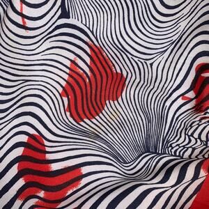 sheer scarf, red scarf, zebra scarf, striped scarf, abstract scarf, statement scarf, lightweight scarf, neck scarf, fashion scarf, retro scarf, vintage style scarf, bold print scarf, black white red scarf, hair scarf, bag scarf, edgy scarf, modern scarf, wave print scarf, chic accessory