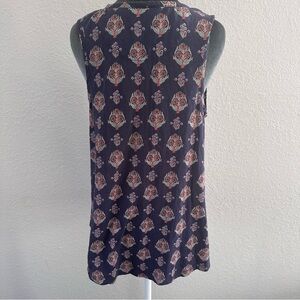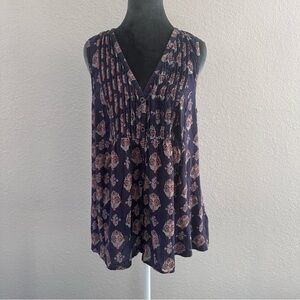 Maeve by Anthropologie sleeveless blouse in a navy blue base with multicolor floral print. Features a flattering V-neckline, partial button front, and pintuck pleating at the bodice for a soft, flowy silhouette. Lightweight and breathable — great for everyday wear or warm weather.