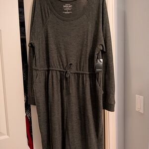 Stylish long sleeve dress with a tie waist. Very light olive color (almost looks grey depending on light). Perfect for casual outings.