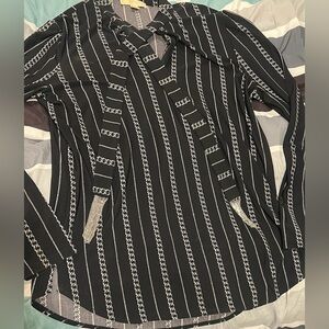 Chic blouse with black and white pattern. Stylish tie detail. Ideal for versatile wear.