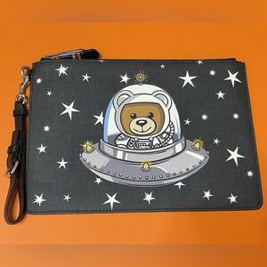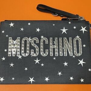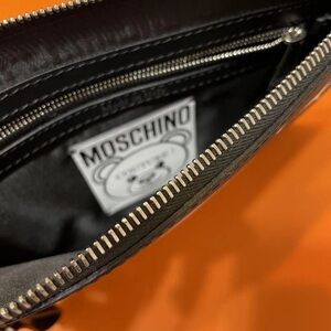 Chic Moschino clutch with sleek black exterior. Features a silver zipper for a modern touch. Ideal for stylish outings.