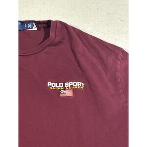 The Polo Ralph Lauren Polo Sport Long Sleeve Shirt is a classic fit men's t-shirt in size large, perfect for both regular and athletic sizes. The maroon color gives it a sporty and versatile look, suitable for all seasons. Made with the signature Polo Ralph Lauren brand, this shirt is a timeless wardrobe staple for any man looking for comfort and style.