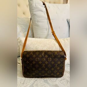 Louis Vuitton crossbody bag with iconic monogram pattern. Features brown and tan colors. See strap call out in last photo. Preloved bag in good condition with some minor signs of wear.