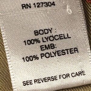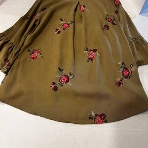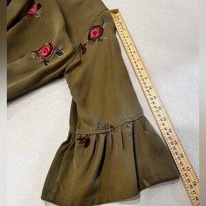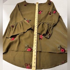 John Mark Olive Green Top Embroidered Flowers Ruffle Bell Sleeve High Low Hem S