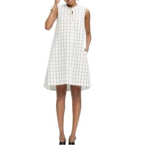 - Madewell dress features a chic A-line silhouette with a sleeveless design and a mandarin collar, perfect for casual or work settings. The cream color and subtle geometric pattern add a touch of elegance, while the flowing cut ensures comfort and style.