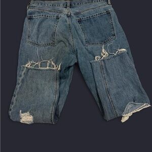 Trendy high-rise jeans with heavy distressing. Perfect for a casual, edgy look.