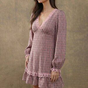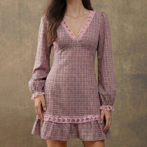 Elegant boho embroidered plaid mini dress in baby pink combines a sleek slim fit with a flounce‑finished hem for a playful mini length. A flattering V‑neck and regular sleeves add classic charm, while the natural mid‑waist accentuates the a‑line silhouette. The eye‑catching plaid pattern and delicate embroidery create a stylish look that stands out in any casual or dress‑up setting.