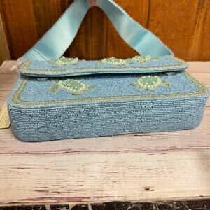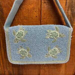 The Viral TikTok Sea Turtle Beaded Bag is a handmade small rectangular shoulder bag made in India. It features a blue exterior with silver hardware, accented with a turtle pattern and sea turtle character design. The bag has a magnetic closure and a lined interior, perfect for casual or travel occasions. The blue beaded handle adds a stylish touch to this unique accessory for women.