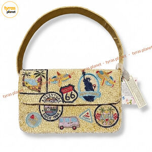 The Viral TikTok RARE Handcrafted in India World Travel Beaded Bag is a unique and stylish shoulder bag perfect for travel and other occasions. Made with colorful beads and featuring a magnetic closure, this medium-sized bag has a multicolor exterior with silver hardware accents. The bag is lined with gold fabric and includes inner pockets for organization. Handmade in India, this limited edition bag showcases travel-inspired patterns and themes, making it a standout accessory for any woman's wardrobe