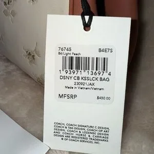 **Bag was used once and is new, all tags and cards included. No dust bag or long strap. There is one small spot on one of the flowers on the ear but it can’t be seen, blends in with the print. Please review photos in depth for condition. You will receive all the items pictured including the amazing Disney Coach hang tag. Item will be shipped with care and comes from a smoke-free home.