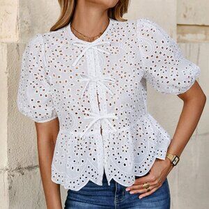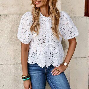 White Boho Women's Front Tie Puff Sleeve Embroidery Blouse Top vacay