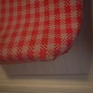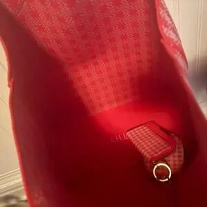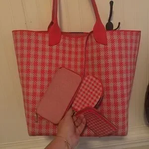 Stylish tote with a red and white checkered pattern. Includes matching accessories. Perfect for everyday use.