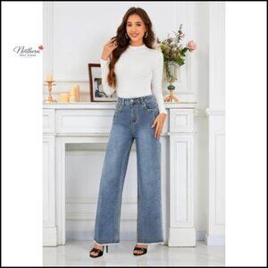 Brand new with tags, these high-waisted wide leg jeans offer ultra comfort and an easy, everyday look perfect for versatile wear. The baggy fit with raw hem provides a relaxed yet stylish silhouette.