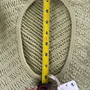 Soft textured fabrication, crew neckline, long-sleeve style, seam detail at underbust, cutout at back, and very stretchy