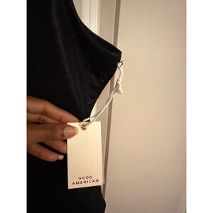 This is a new with tags Good American women's black faux leather bodysuit, size 0 which is an XS(will fit size 2 and smaller 4). The sleeveless design features a round neckline and a center seam running down the front and back. The material appears to be a coated fabric, likely polyurethane, with a slight sheen. The bodysuit has a thong-style bottom with snap closures. The care tag indicates a composition of 100% polyurethane for the self front and 95% polyester, 5% elastane for the self back, with a lining of 95% polyester, 5% elastane.