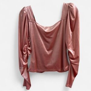 Express light pink velvet long sleeve top. Slightly puffed sleeves. Sweetheart neckline. Ruched front with ruched sleeves. Very stretchy material.