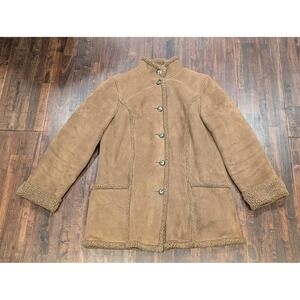 LL Bean Jacket Womens Medium Brown Faux Shearling Fleece Lined Suede Button Coat