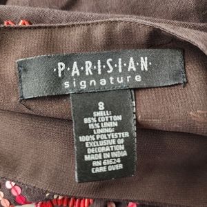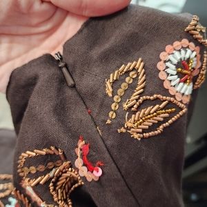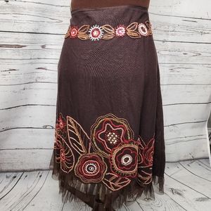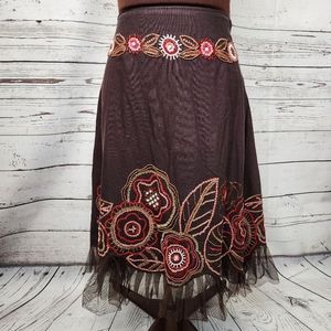 Vintage Parisian Midi skirt. Brown linen blend with floral bead accents. Tulle hem. Size 8. Approx 15 inch flat waist and 26 inches long. Some wear on the beads near the zipper
