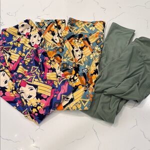 Listing includes all three leggings. 2 Disney Pocahontas pair and one solid green. True to LLR sizing