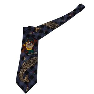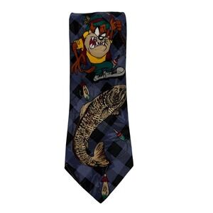 Looney Tunes Tazmanian Devil Fishing Tie 1996 Polyester Blue Plaid Work