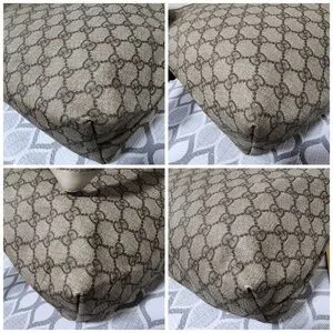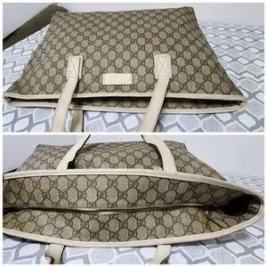 This authentic Gucci GG Supreme Tote Bag Brown/Off-White is in its pre-owned condition. The exterior is clean. The edges shows some sign of rubbing wear to it. The handle shows sign of glazing, scratches and rubbing wear to the off-white leather trim that runs around the bag. The interior is clean but shows sign of discoloration to it. Kindly look at pictures above for all details.