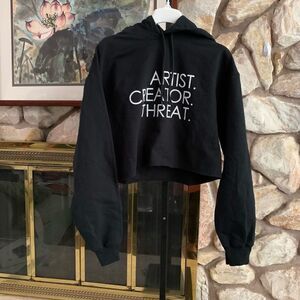 Dopesciety cropped black hoodies with white lettering. artist. Creator. Threat.