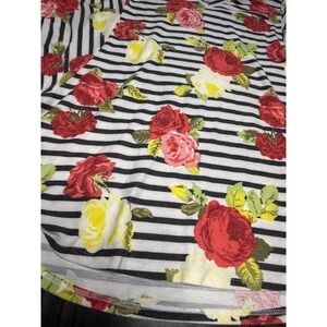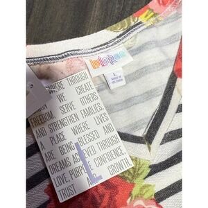 Keywords: LuLaRoe Renee, floral blouse, striped top, dolman sleeve, v-neck top, womens blouse, size large, casual top, fashion top, comfortable blouse, black and white, rose print, LuLaRoe top, Renee top