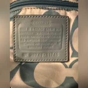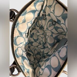 Coach Hampton Nylon Tote Bag in black with tan canvas straps and light blue leather trim.
