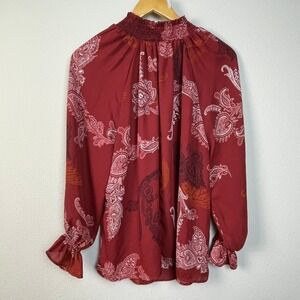 Cocomo Woman Red Paisley Print Smocked Neck Long Sleeve Blouse Top 1X Boho Fairy