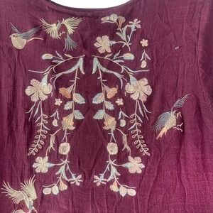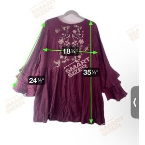 Beautiful boho-inspired burgundy tunic dress featuring floral and bird embroidery on the front, tiered ruffle bell sleeves, and a flowy silhouette. Lightweight, comfortable, and perfect for layering year-round. Can be worn as a tunic or a short dress depending on height.