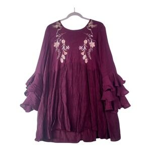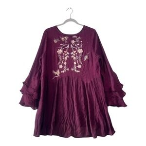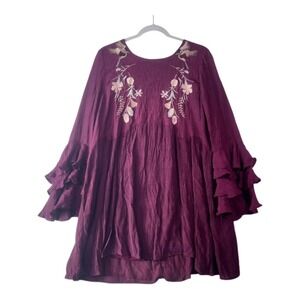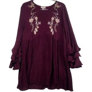 Umgee Burgundy Embroidered Ruffle-Sleeve Tunic Dress – Size Large