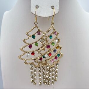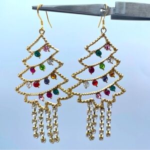 Gold- tone Christmas tree chandelier earrings, adorned with vibrant multicolor rhinestones that shimmer like holiday lights.